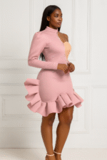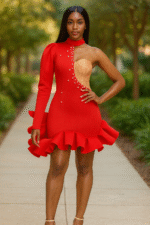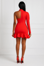 This Lizzy Beaded Short Dress With Flare is designed as a one shoulder long sleeve dress.