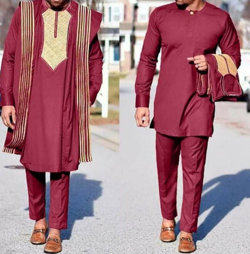 This Ogbuagu Wine 3-Piece African Clothing with full embroidery comes with an inner, a pant and an outer piece which has full thread embroidery.Â