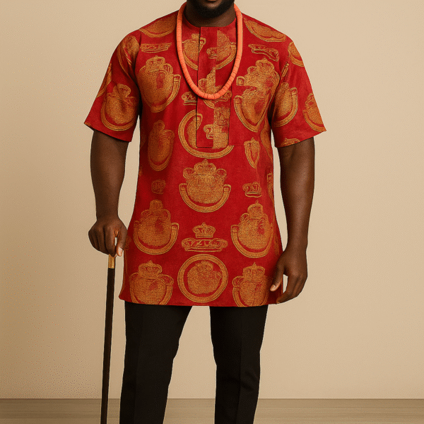 Featuring a tailored fit, short sleeves, and high-quality detailing, this attire pairs perfectly with dress trousers and accessories for a complete regal appearance. Whether you’re attending a ceremony or making a statement at a photoshoot, this timeless African wear ensures you stand out with pride and sophistication.