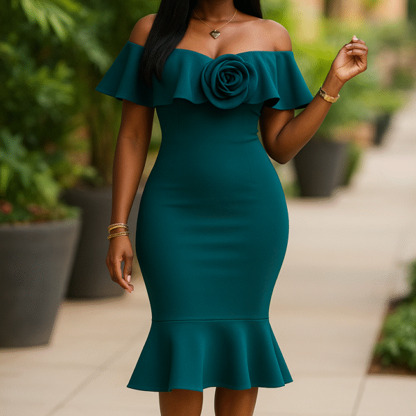This Sharon Wine Evening Dress is designed as an off shoulder dress. The sleeve is a short sleeve with a fold across the bust. The dress has a flare at the hem with the back longer than the front.