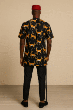 Introducing the Savanna Royale Men’s African Heritage Attire, a premium traditional wear designed for weddings, cultural celebrations, photoshoots, and prestigious events. This outfit features a bold black base adorned with striking golden-antelope patterns inspired by African wildlife elegance. Tailored for a modern fit and crafted with high-quality fabric, this attire delivers a stylish balance of culture, sophistication, and comfort.