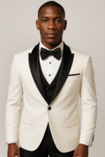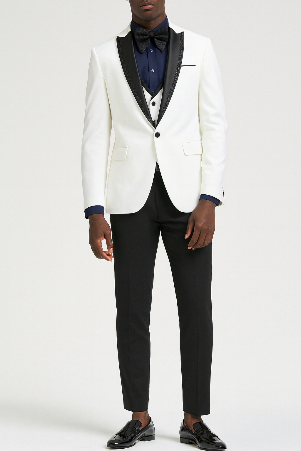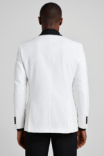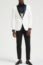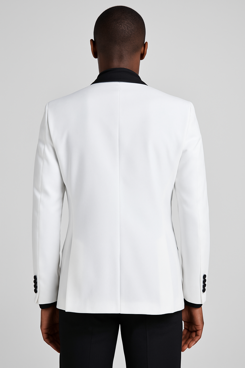 Command attention in the JEVGLAM Regal Noir Tuxedo, a striking combination of elegance and edge. This premium white tuxedo jacket with contrasting black lapels is designed for the man who owns every room he walks into. Perfect for weddings, galas, or high-profile events in Edmonton, this suit redefines modern luxury with a classic black-and-white statement.