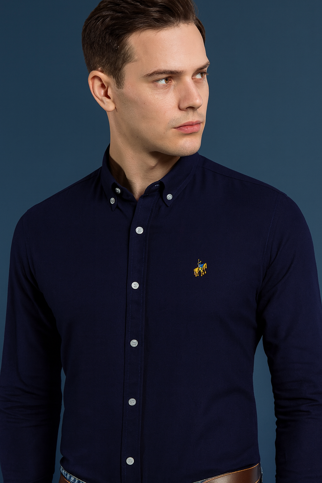 Step into timeless sophistication with the JEVGLAM Navy Blue Button-Down Oxford Shirt for Men. Crafted from premium cotton blend fabric, this shirt delivers exceptional comfort and a polished look for both business and casual occasions. The signature polo-style embroidered horseman logo on the chest adds a refined designer touch, while the button-down collar and tailored fit ensure a clean, modern silhouette. Perfect for pairing with chinos, jeans, or dress trousers, this versatile long-sleeve shirt transitions seamlessly from the office to evening outings.