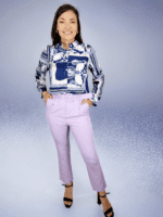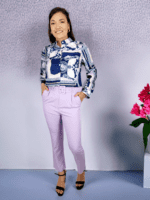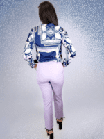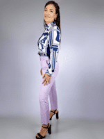 This sophisticated and stylish outfit features a combination of a patterned blouse and high-waisted pants, perfect for making a fashion statement. The long-sleeved blouse showcases a striking vintage-inspired print in navy, white, and pastel tones, adorned with intricate motifs and geometric patterns. The collared design and button-down front add a classic touch, while the vivid print brings a contemporary flair. Paired with the blouse are sleek, high-waisted pants in a soft lavender hue, complete with a matching belt to accentuate the waist and provide a tailored fit. The pants have a slim, straight-leg silhouette, offering a polished look that balances the boldness of the blouse. Ideal for both professional and social settings, this ensemble exudes confidence and elegance.