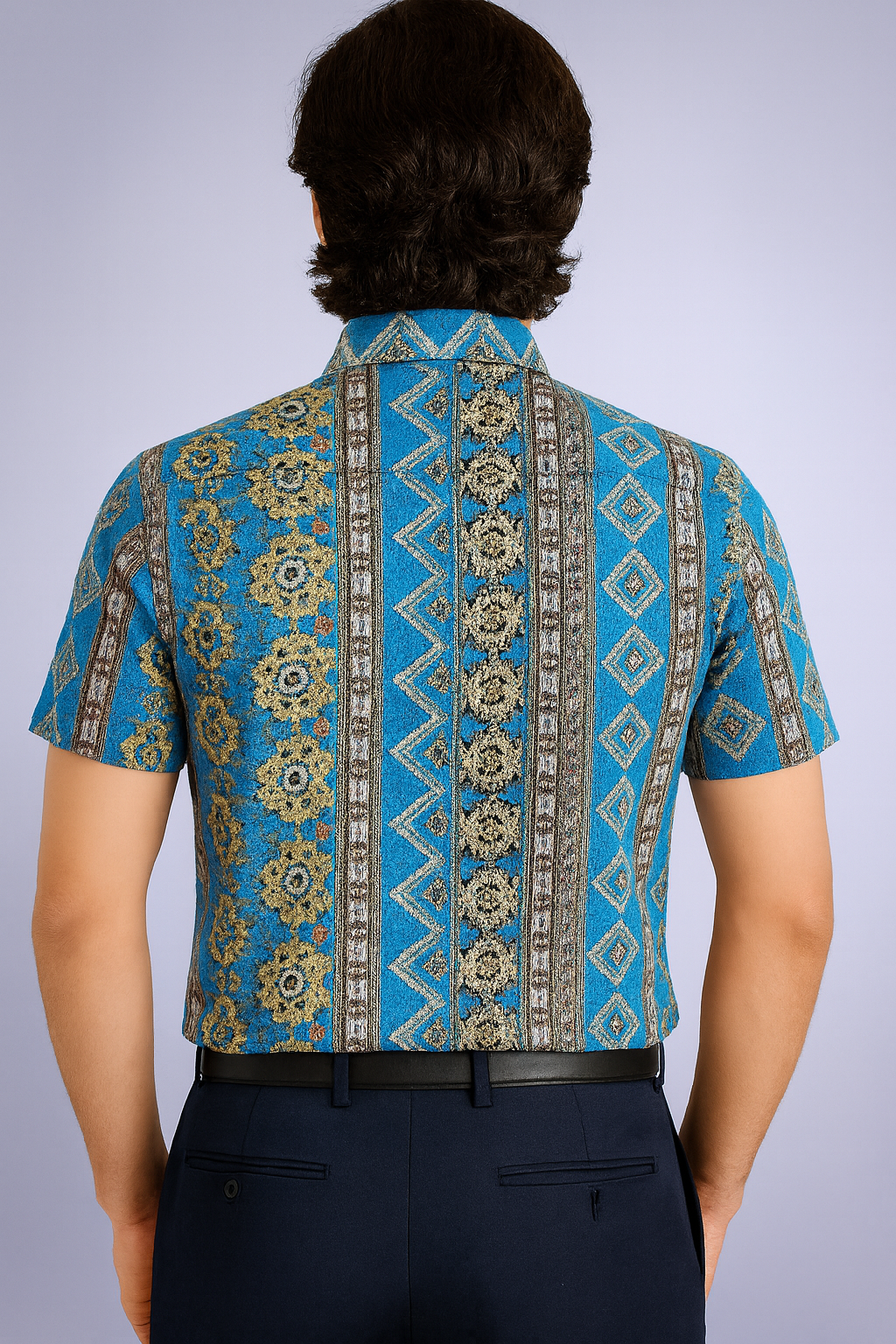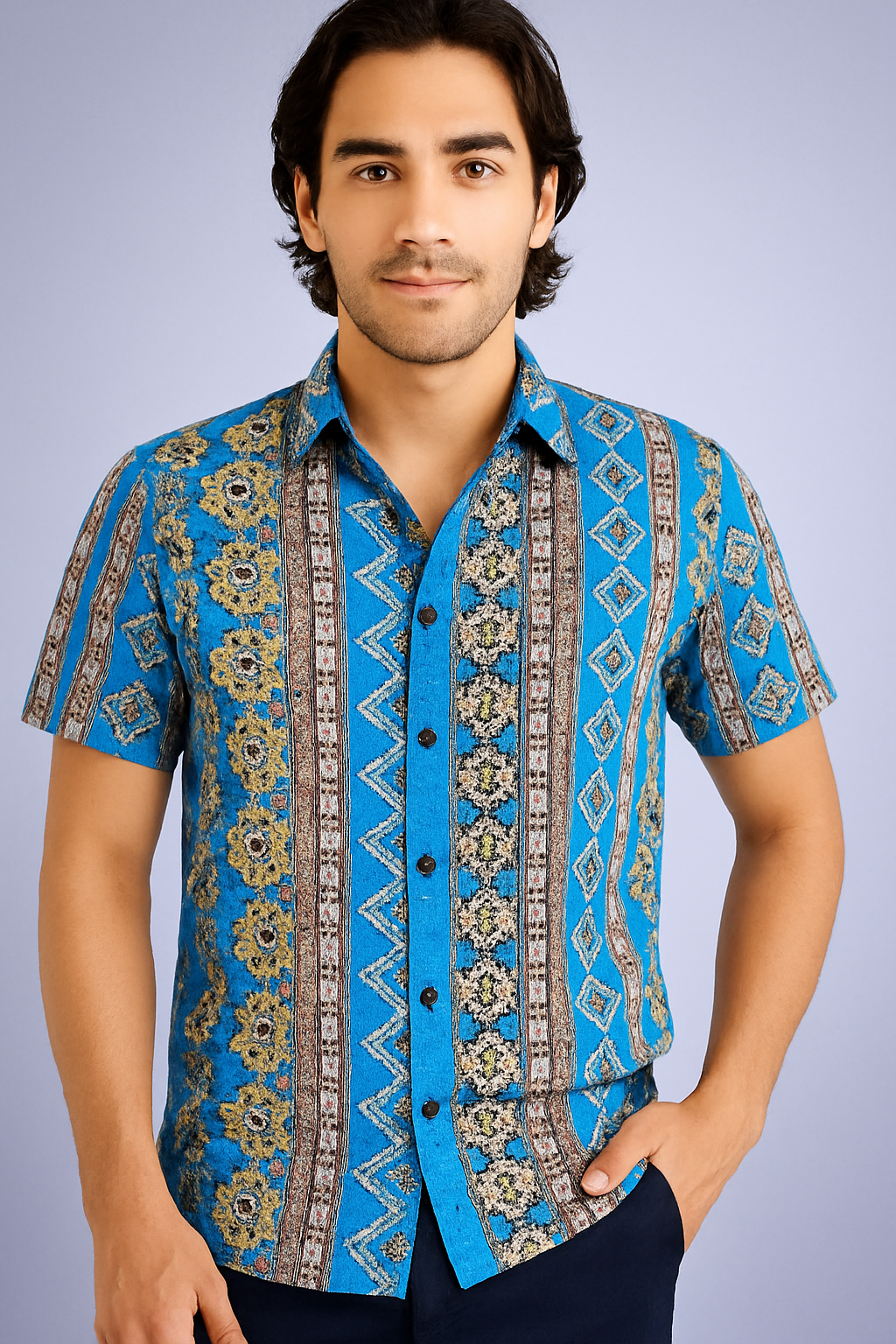 The Azure Batik Shirt can be paired with casual trousers or shorts for a relaxed yet fashionable look.