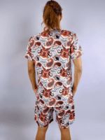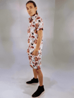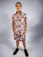 The “Paisley Pop Set” is a vibrant, matching ensemble consisting of a short-sleeve button-up shirt and shorts. The fabric features a bold, colorful paisley pattern with intricate details in shades of red, orange, blue, and white against a dark white background. This eye-catching set is perfect for making a statement in casual settings, offering both comfort and style. The lightweight material is ideal for warm weather, while the classic paisley design adds a touch of retro flair. Paired with simple black shoes, the look is both modern and timeless.