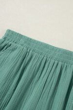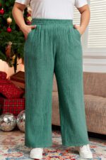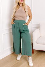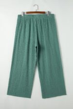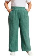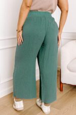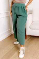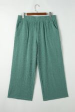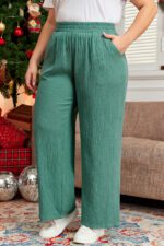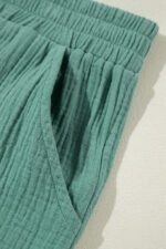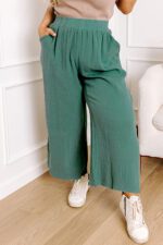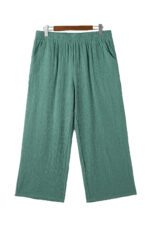 These relaxed, wide-leg lounge pants in a rich evergreen hue are perfect for cozy days at home or casual outings. Made from a soft, crinkled fabric, they feature an elastic waistband and functional side pockets for maximum comfort and practicality. Their flowy silhouette ensures easy movement while maintaining a stylish yet laid-back look.