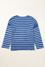 This relaxed-fit striped sweater combines effortless style and comfort. The classic blue and white stripe pattern evokes a nautical charm, perfect for casual outings or layering on breezy days. Made from a soft knit fabric, it features a slightly oversized silhouette with dropped shoulders and long sleeves, making it both stylish and cozy.