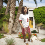 T-shirt: The white t-shirt is adorned with a central pocket and sleeve cuffs in a red and beige tribal print. This pattern is intricately designed, showcasing traditional motifs that add a touch of cultural heritage to the contemporary look.