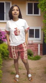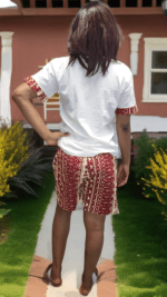 The Rustic Heritage Ensemble is a stylish and comfortable outfit that merges modern fashion with traditional cultural elements. The ensemble includes a white t-shirt and matching shorts, both featuring a bold red and beige tribal pattern.