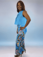 The Vibrant Faith Ensemble is a lively and expressive outfit that combines bold colors and intricate patterns for a striking and joyful look. The top is a sleeveless, sky-blue tank with a high neckline, featuring the word “faith” artistically printed in black, forming a cross. This graphic element adds a touch of personal meaning and inspiration to the outfit, making it more than just a fashion statement.