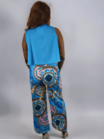 The pants are the highlight of this ensemble, featuring an exuberant pattern in shades of blue, pink, green, and gold. The wide-leg silhouette adds a breezy and comfortable feel, perfect for making a statement while staying relaxed. The intricate paisley and baroque-inspired designs create a captivating visual appeal, ensuring all eyes are on you.